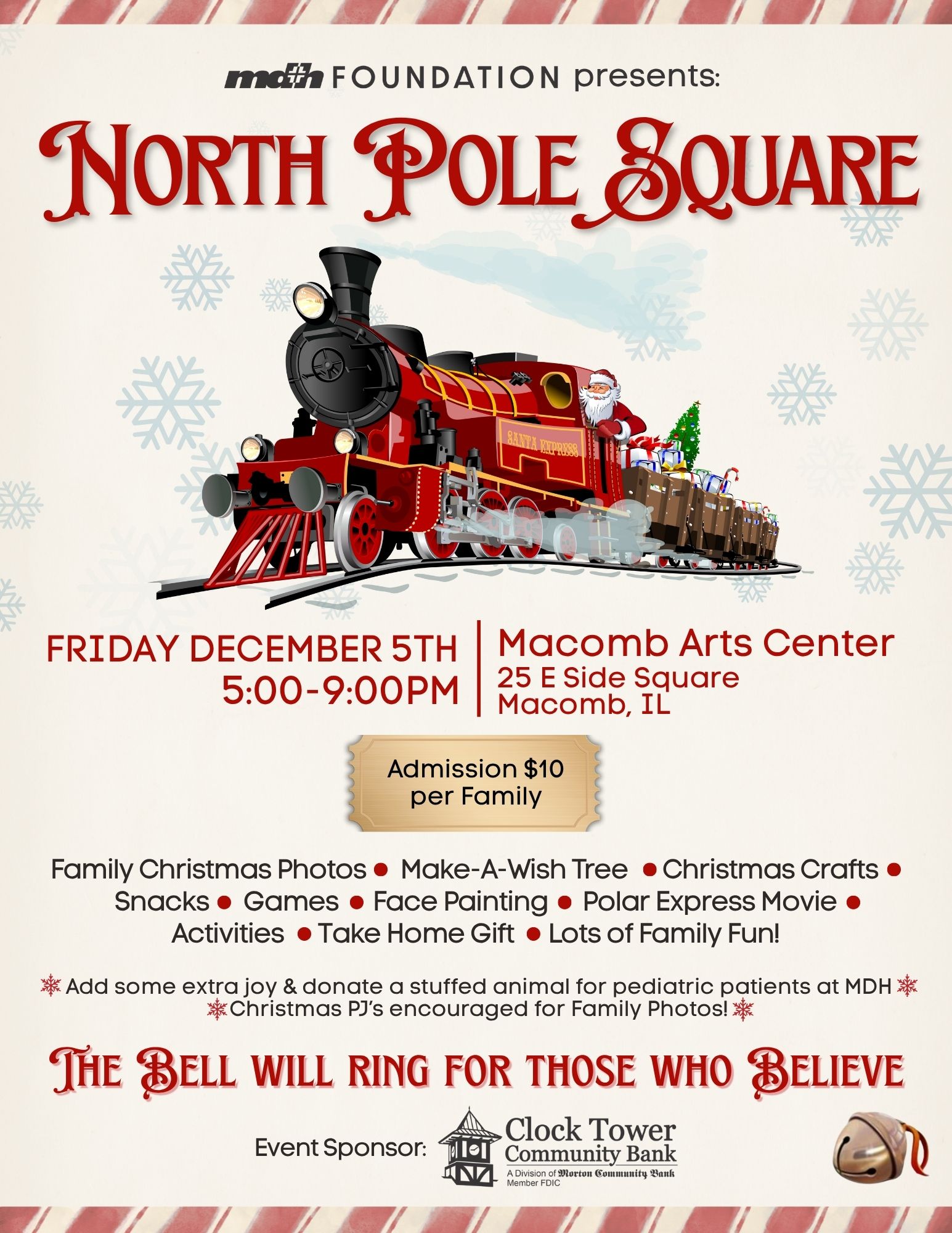 While renovations at the Macomb Arts Center are mostly complete, the electrical updates needed to power our Festival of Trees aren’t finished. Because of that, we’re introducing an event that requires less electricity but still brings the magic of the season: North Pole Square. This event will tie into the Polar Express, with Santa arriving on the Amtrak from Quincy.
