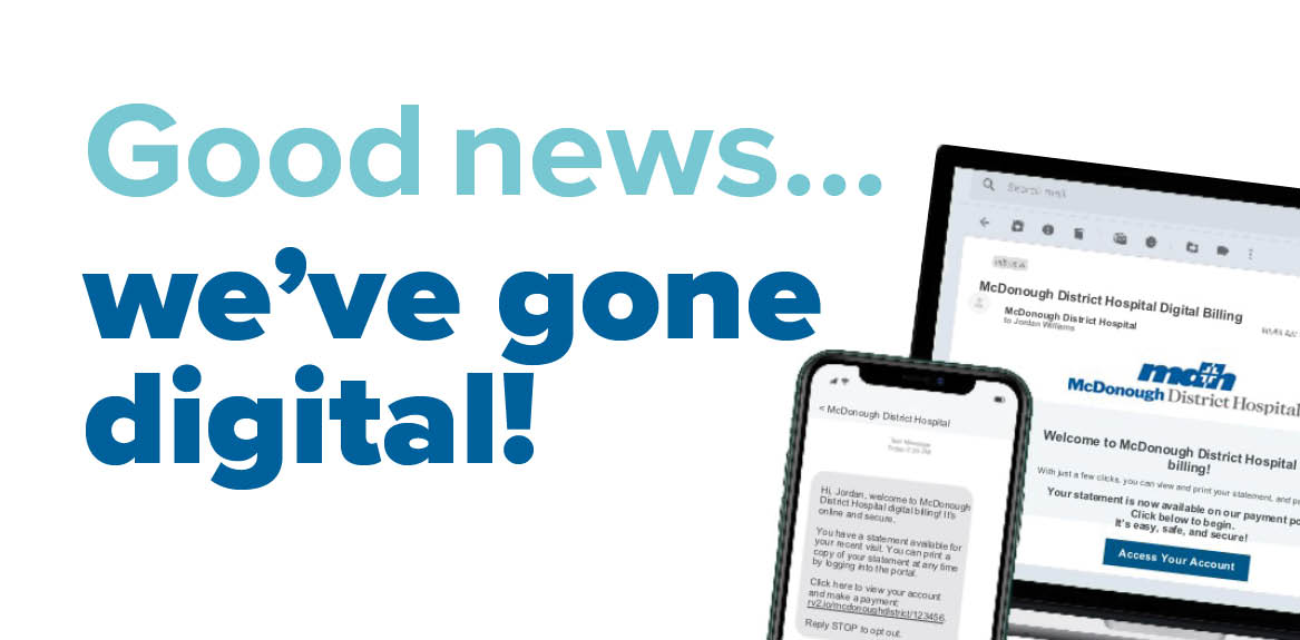 McDonough District Hospital will be offering a new convenient way to pay your medical bills online. Our new payment platform allows patients to opt in and receive bill notifications via text messages or email.